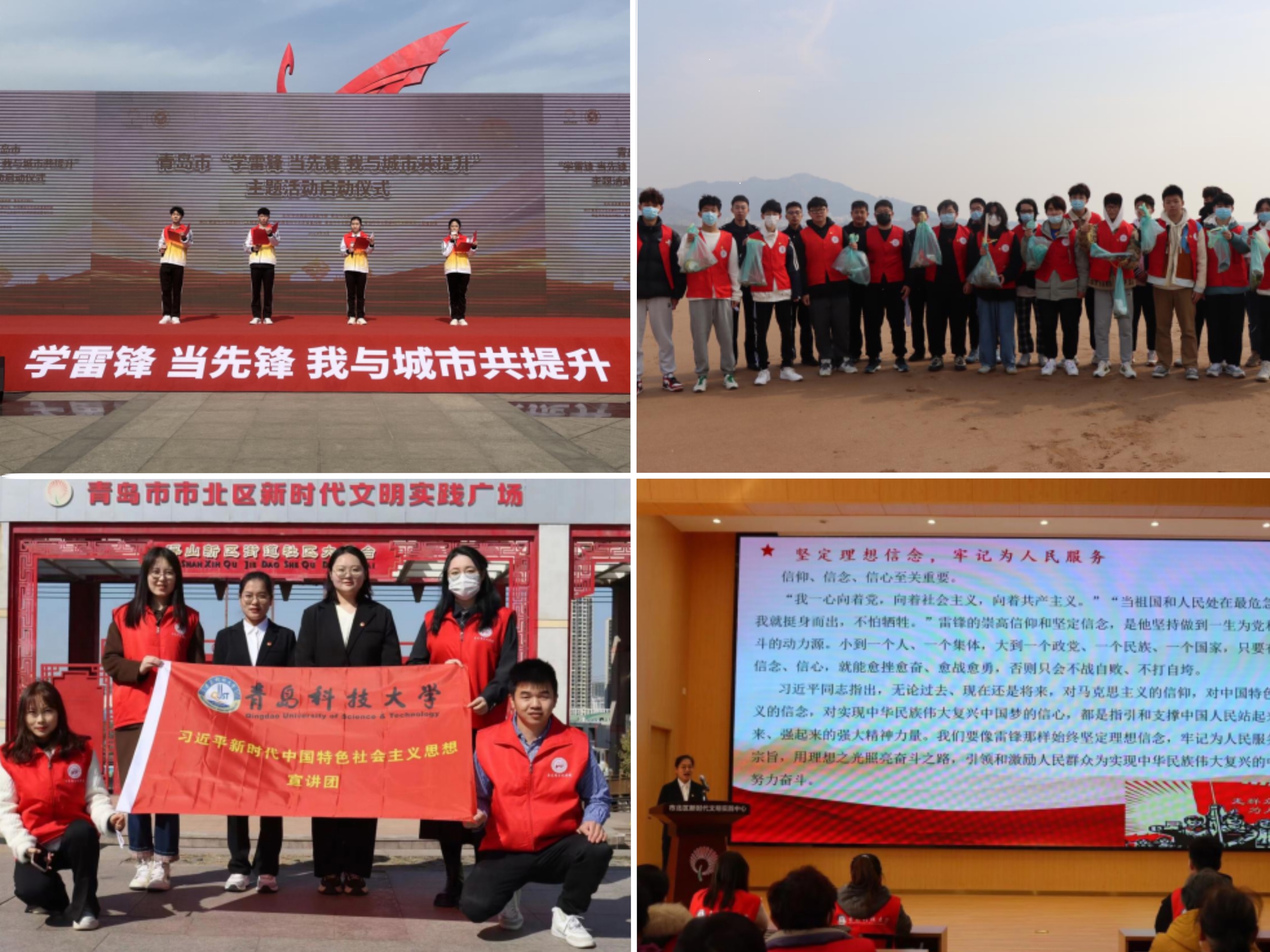 校团委积极对接市北区文明办,参与青岛市“学雷锋 当先锋 我与城市共提升”主题活动启动仪式,4名青科大青年用“科大之声”面向全市发出学雷锋倡议;主动对接市北区委宣传部,联合马克思主义学院团总支,从青年宣讲团选拔2名青年代表庞靖、李婷婷走进市北区新时代文明实践中心开展“学习宣传贯彻党的二十大和二十届二中全会精神,弘扬新时代雷锋精神”主题云宣讲;组织大学生艺术团,走进市北区大港街道开展进“艺术进社区 奉献暖人心”学雷锋日义演,实现艺术表演进社区、志愿服务进社区。校团委、机电学院团委联合青岛市崂山区海岸警察支队,在石老人海水浴场开展海滩清洁志愿服务,为海洋生态保护贡献青年力量。校学生会开展“学习雷锋精神·青科大在行动”社区志愿服务活动,青年志愿者走进青岛市李沧区祥红敬老院,扎实开展“爱老敬老”志愿服务,当好志愿服务引领者和生力军。材料学院“爱心源材料”志愿服务组织前往市北区前哨敬老院,与老人们一起完成保健活动,陪老人聊天并打扫卫生,用行动关心关爱老年人,培养敬老爱老之心。环境学院团委组织青年志愿者协会前往青岛北站开展旅客指引、行李搬运志愿服务;组织安全行动社前往附近社区开展消防通道安全隐患排查。