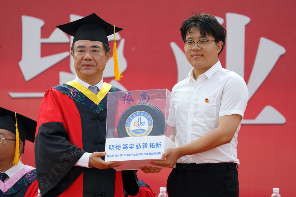 党委书记马连湘代表学校接受毕业生赠送给学校的浮雕作品《起航》、纪念品“橡尚”轮胎、剪纸作品《传承》。马连湘代表学校向毕业生代表回赠“一生科大情•共筑中国梦”纪念卡,寄语毕业生在建党100周年之际扬帆远航,要坚守初心使命、传承科大家风、厚植家国情怀,主动担当国家高水平科技自立自强使命,为母校增光添彩、让青春熠熠闪光。