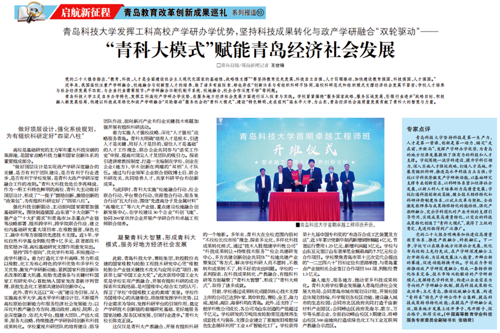 5月22日,《青岛日报》第5版以《beat365官方网站发挥工科高校产学研办学优势,坚持科技成果转化与政产学研融合“双轮驱动”——“青科大模式”赋能青岛经济社会发展》为题报道了学校第七届青岛市教育改革创新奖获奖成果。