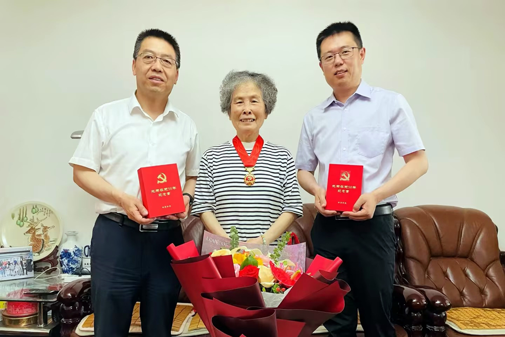 吕万翔一行先后走访了高龄党员离休干部鲁冰、邹志静和“光荣在党50年”党员代表,与他们亲切交谈,详细了解他们的身体情况、思想生活状况,并感谢他们在学校事业发展中做出的重要贡献,感谢他们长期以来对党的事业和学校工作的关心支持,叮嘱他们要保重身体,保持积极乐观的心态,坚守精神家园,安享幸福晚年,同时希望他们继续关注学校事业发展,为推动学校高质量发展建言献策做贡献。今年学校颁发“光荣在党50年”纪念章13枚,为21名困难党员送去慰问金。