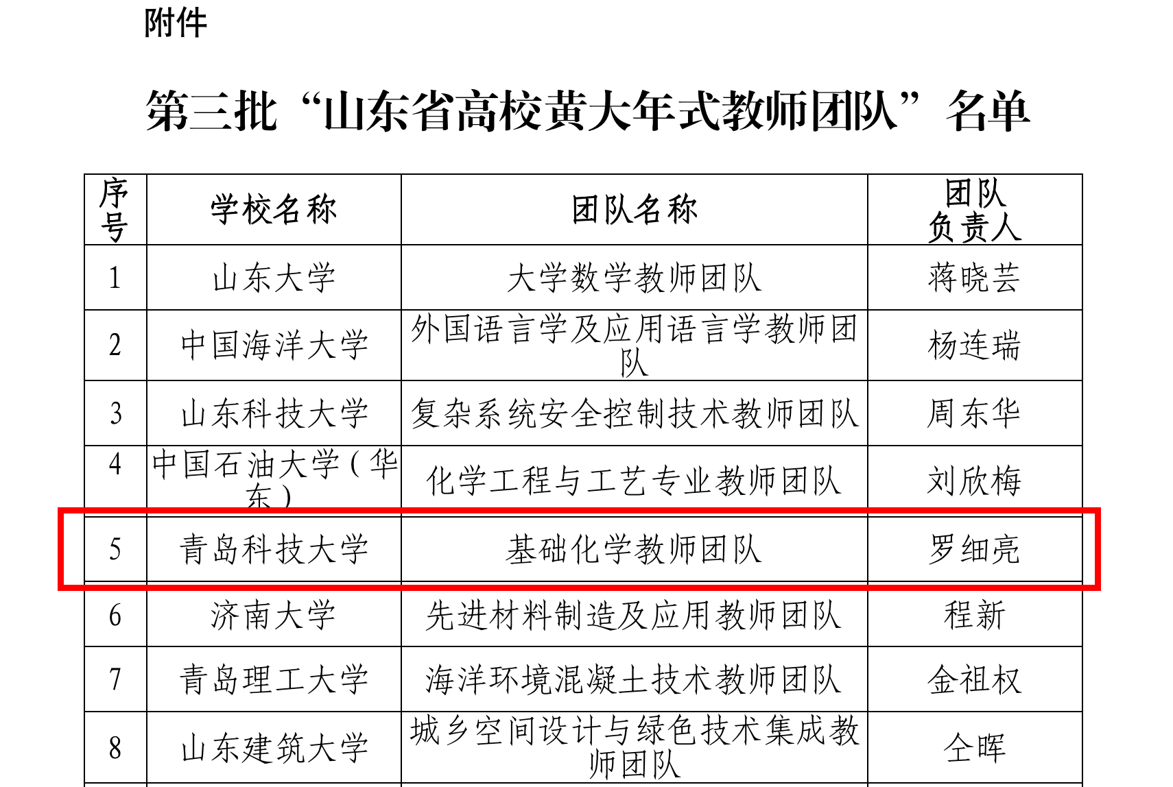 近日,山东省教育厅发布《关于公布第三批“山东省高校黄大年式教师团队”名单的通知》(鲁教师函〔2023〕44号),beat365官方网站罗细亮教授领衔的基础化学教师团队成功入选。截至目前,学校已有3个教师团队获批“山东省高校黄大年式教师团队”。