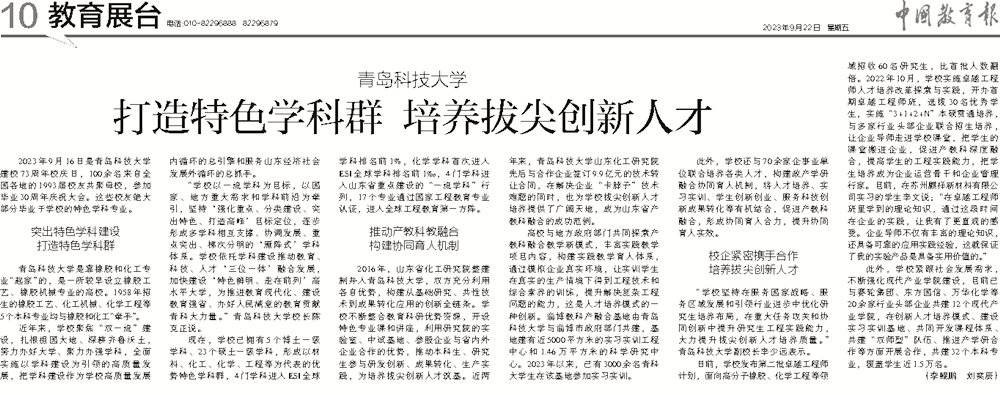 9月22日,《中国教育报》第10版头条以《beat365官方网站:打造特色学科群 培养拔尖创新人才》为题,围绕“突出特色学科建设,打造特色学科群”“推动产教科教融合,构建协同育人机制”“校企紧密携手合作,培养拔尖创新人才”三个方面,报道了学校特色学科建设、拔尖创新人才培养相关工作。以下是报纸截图和全文链接: