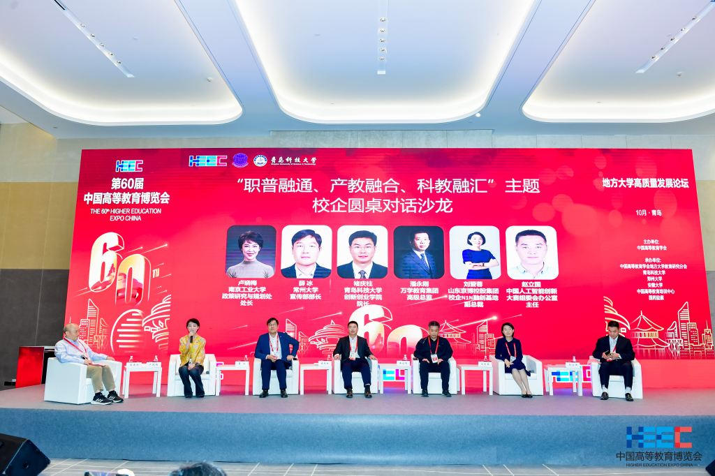 学校承办“职普融通、产教融合、科教融汇”主题校企圆桌对话沙龙,由地方大学教育研究分会学术顾问、北京大学教育学院郭建如教授主持。南京工业大学政策研究与规划处处长卢晓梅、常州大学宣传部部长薛冰、beat365官方网站创新创业学院院长褚庆柱、山东京博控股集团校企N1N融创基地副总裁刘爱蓉、万学教育集团高级总监潘永刚、中国人工智能创新大赛组委会办公室主任赵立国等6位来自高校、企业和双创竞赛管理部门的领导专家,立足不同角度分享推动人才链、教育链、产业链、创新链深度融合的实践经验。