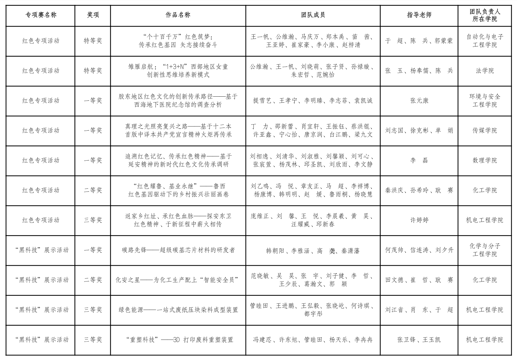 根据第十八届“挑战杯”全国大学生课外学术科技作品竞赛组委会统一安排,山东省竞赛组委会在“挑战杯”省赛框架下分别举办了红色专项和“黑科技”展示活动。本届红色专项展示活动以“实践感悟新时代,挺膺担当新征程”为主题,广大青年学子通过社会实践接受红色教育,以丰富的成果展示感召更多青年,全省共通报表扬320项作品。在“黑科技”展示活动中,围绕“卡脖子”问题、前沿领域、高精尖技术,大学生科创团队创造性地解决各类生产生活中的难点问题,全省共通报表扬104项作品。