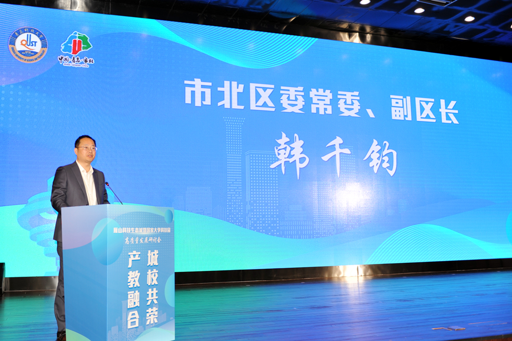 韩千钧代表市北区致辞。他介绍了市北区的发展历史、区位优势。韩千钧指出,当前,市北区正锚定建设繁荣美丽幸福的现代化国际城区目标,全面发力扩大内需、招商引资、城市更新、服务升级、民生保障“五大战场”,加快构建“2+6”特色产业体系,着力推动数字经济、现代金融等产业集聚发展。相信通过举办此次高质量发展研讨会,将进一步促进政校企互联互通、共创共赢,推动构建完善产学研协同创新生态体系,为区域经济崛起注入强劲动力。
