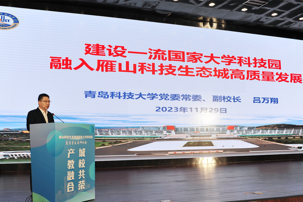 吕万翔代表学校作了题为《建设一流国家大学科技园、融入雁山科技生态城高质量发展》的报告,介绍了学校发挥产学研优势服务地方经济社会发展的工作举措与成效,列举了学校建设一流大学科技园、孵化高质量创新成果的相关典型案例,阐述了学校打造青科大产学研创新核、助力雁山科技生态城创新能级提升的建设与发展规划。