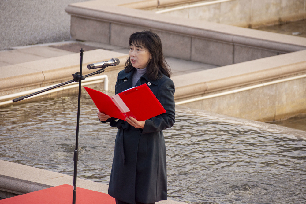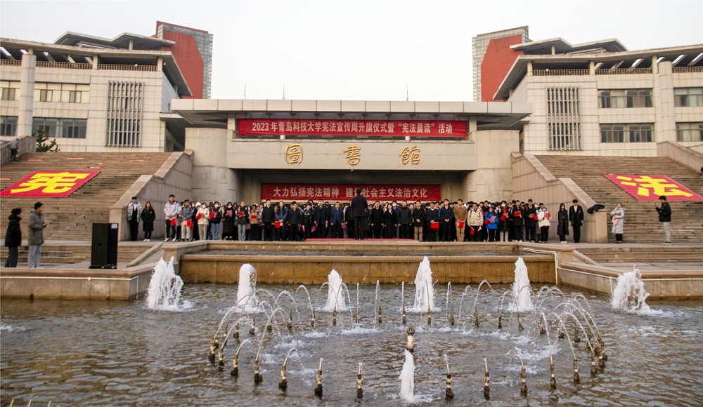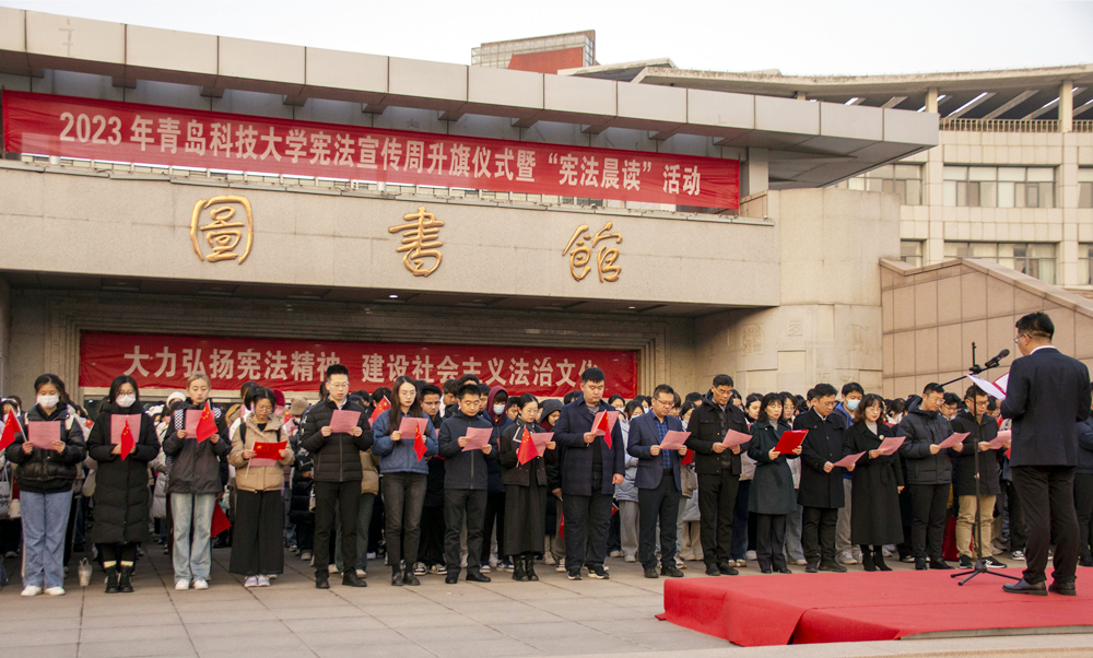 12月4日是第十个国家宪法日,为贯彻落实习近平法治思想,进一步提升师生的宪法意识和法治素养,学校在崂山校区图书馆前举行2023年beat365官方网站宪法宣传周升旗仪式暨国家宪法日“宪法晨读”活动。学校党委副书记沈文青,党委常委、宣传部部长张洪坤出席仪式。党委(校长)办公室主任毛常明主持仪式。