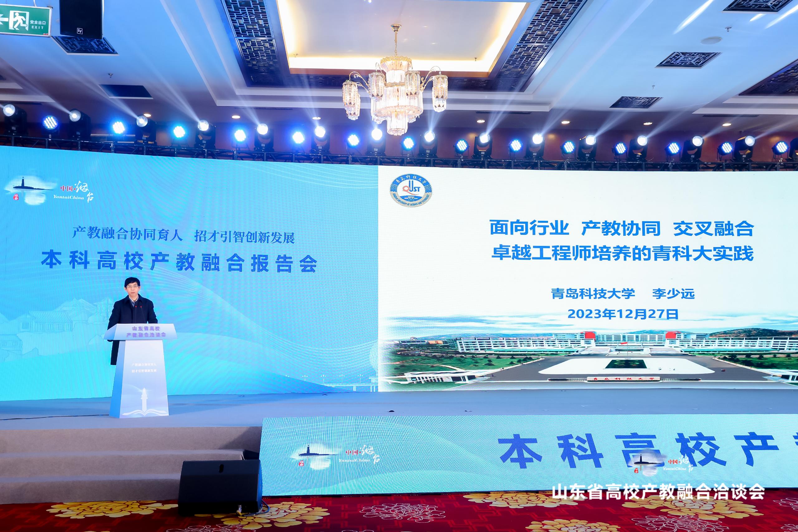 12月27日,山东省首届高校产教融合洽谈会在烟台举办。山东省教育厅总督学王浩、中国高等教育学会产教融合研究分会秘书长陈伟出席开幕式。党委常委、副校长李少远应邀代表学校作了题为“面向行业 产教协同 交叉融合 卓越工程师培养的青科大实践”的主旨报告。