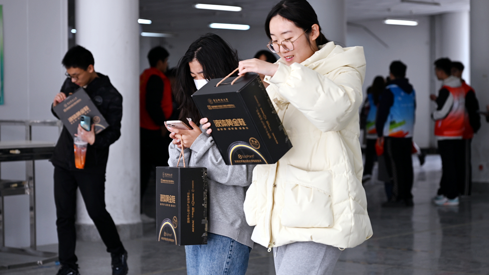 发放现场还吸引了不少同学通过自媒体账号进行直播,“这次发放的黄金鞋共有4种款型12种颜色。前期同学们已经通过小程序预定了自己中意的颜色和款式,现在他们正在操场有序领取。”艺术学院产品设计专业大二学生谢珍通过网络直播着发放现场的实况。