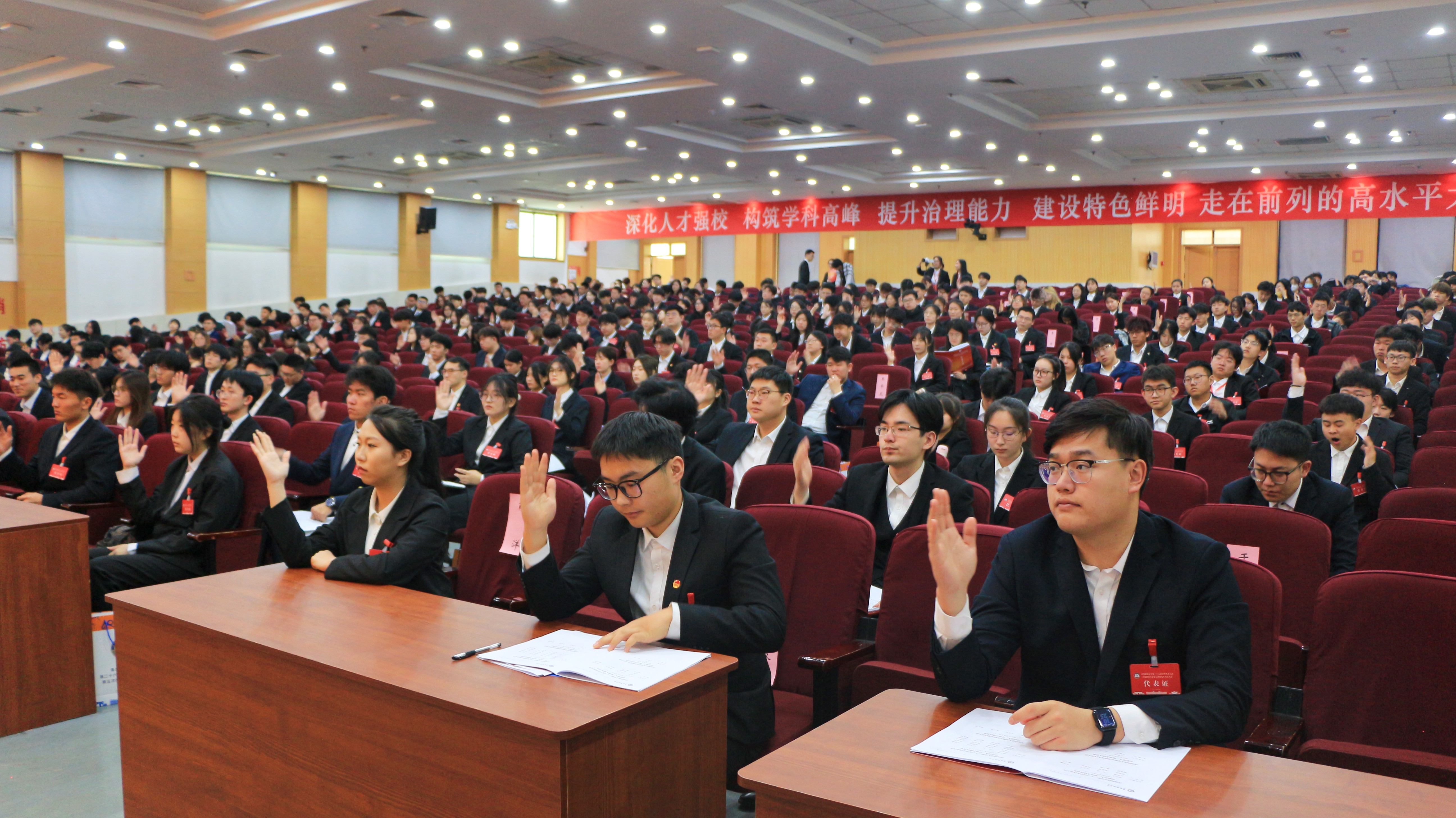 丁林代表学校党委讲话。他充分肯定了学校学生会、研究生会在坚定政治方向、聚焦服务同学、凸显大局贡献的工作成效,并向全校学生提出四点希望:一是要坚定理想信念,做尊法崇德的科大青年。全校学生要用习近平新时代中国特色社会主义思想武装头脑,牢固树立法治观念,学习宪法法律,掌握法治本领,做到明法笃行、守法用法、捍卫法治;要养成良好道德品质,树立正确的世界观、人生观、价值观,自觉践行和弘扬社会主义核心价值观,做到德法兼修、明礼知耻、崇德向善。二是要坚持大道正义,做光明诚信的科大青年。全校学生要坚守人性良知、大道正义、原则底线,内正其心、外正其容,履行公民义务,增强责任意识,恪守契约精神,自省、自律、自觉,抵制功利主义诱惑,做到自我激励、自我批判、自我超越;要自觉遵守学术诚信、社交诚信、生活诚信,尊重事实、尊重规则、尊重他人、尊重自己,做到实事求是、真诚待人、知行合一。三是要坚守奋斗底色,做“自找苦吃”的科大青年。全校学生要锚定党和国家的第二个百年奋斗目标、学校高水平大学建设目标、德智体美劳全面发展目标,学好专业,如饥似渴学习科学文化知识与技能,提高本领,积极参加科技竞赛、社会实践、志愿服务、体育比赛,做到求真务实、脚踏实地、孜孜不倦;要培养创新思维,成为拔尖创新人才和高素质应用型人才,主动担苦、担难、担重,在实践中经风雨、见世面、壮筋骨、长才干,做到发现自我、找到自我、成就自我。四是要坚决担当作为,做奋勇争先的科大青年。全校学生要主动立足学校发展战略所需,积极投身学术研究、创新创业、社会服务、参军报国和文化传承创新,向身边的创新团队、优秀同学学习,做到对标先进、学习先进、争当先进;要围绕新质生产力,推动自身观念更新、知识更新、技能更新,提升原始创新能力、技术攻关能力、科学研究能力、成果转化能力,做到乘势而上、挺膺担当、勇立潮头。