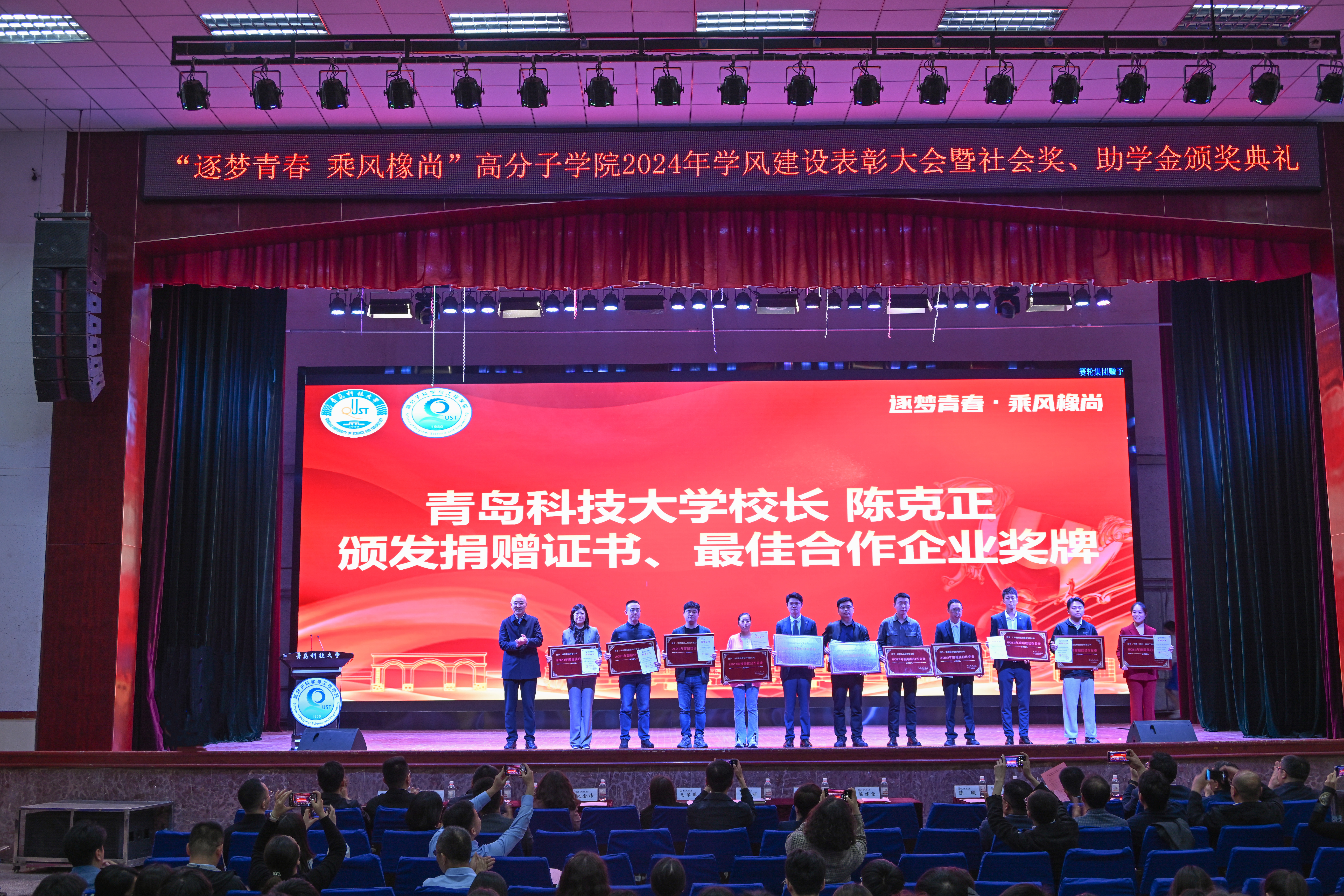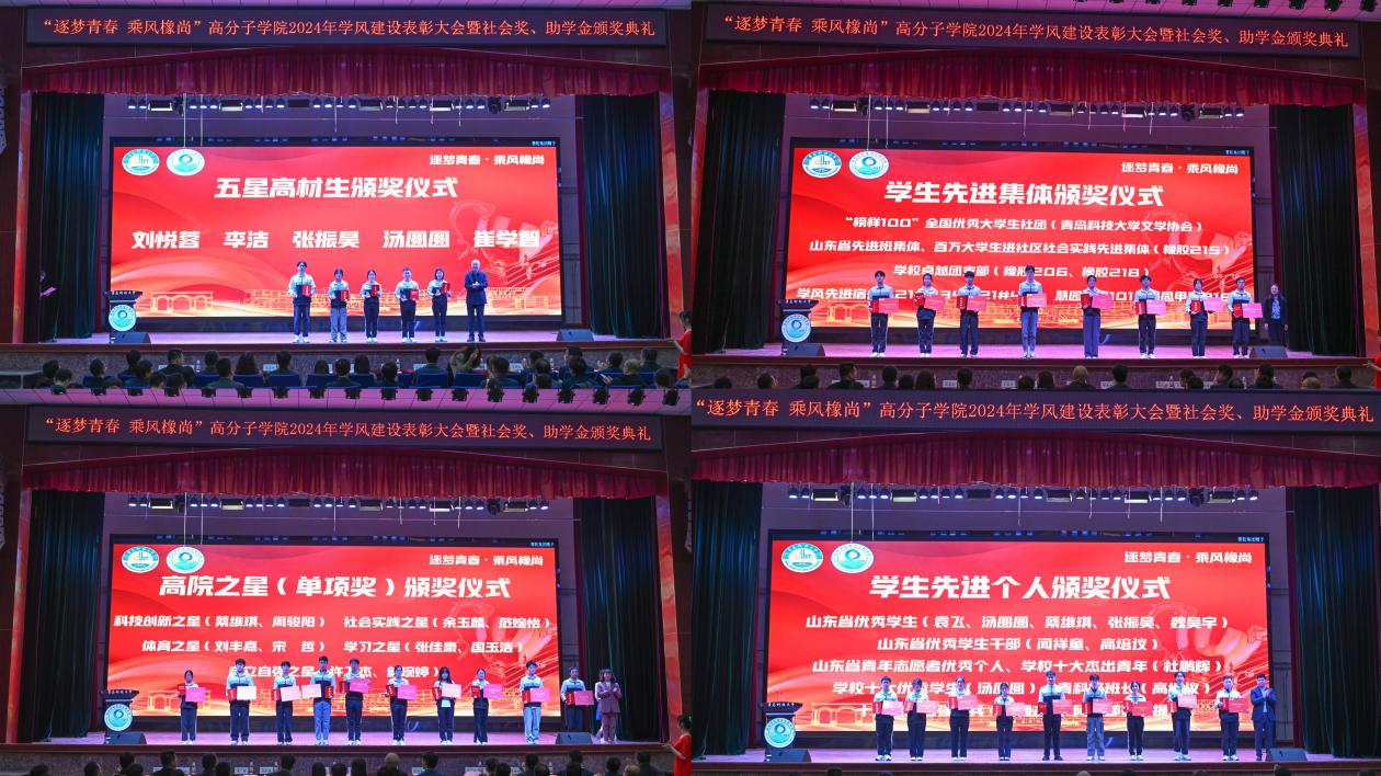 5月7日,高分子学院“逐梦青春 乘风橡尚”2024年学风建设表彰大会暨社会奖助学金颁奖典礼在四方校区举行。校长陈克正出席典礼,为2023年度高分子学院“五星高材生”颁奖,并为2023年度设奖助学金企业代表颁发捐赠证书、最佳合作企业奖牌。本年度社会奖助学金首次涵盖16名高密校区高材系学生。