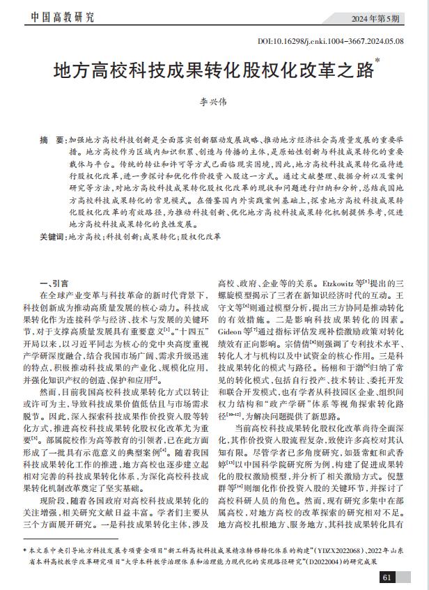近日,《中国高教研究》(CSSCI来源期刊)2024年第5期发表党委书记李兴伟署名文章《地方高校科技成果转化股权化改革之路》。