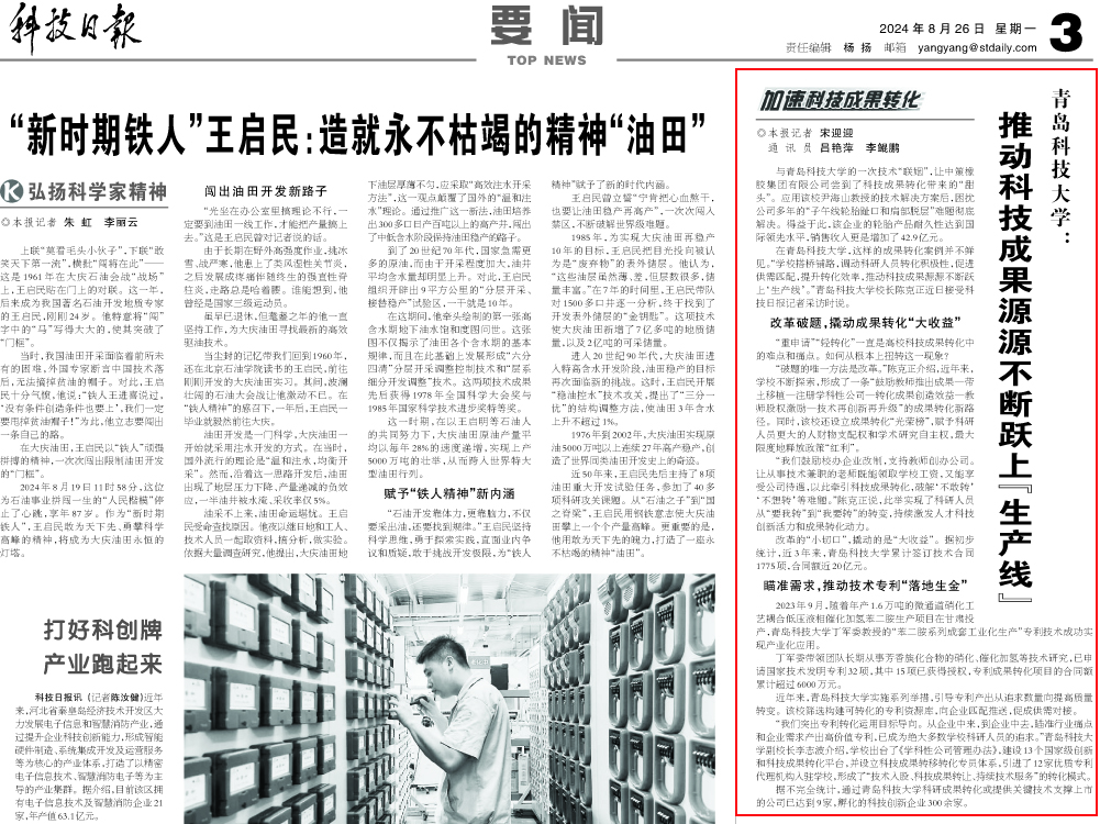 8月26日,《科技日报》要闻版以《beat365官方网站:推动科技成果源源不断跃上“生产线”》为题,宣传报道学校在科技成果转化方面的典型经验做法和工作成效。