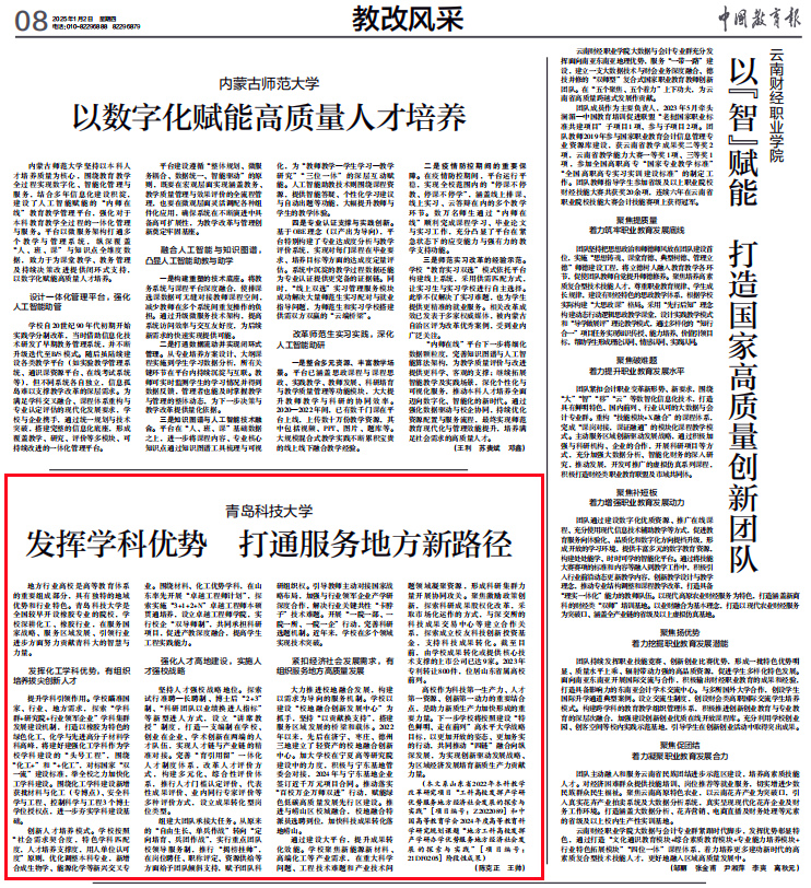 1月2日,《中国教育报》以《beat365官方网站:发挥学科优势 打通服务地方新路径》为题,从“发挥化工学科优势,有组织培养拔尖创新人才”“强化人才高地建设,实施人才强校战略”“紧扣经济社会发展需求,有组织服务地方高质量发展”三个方面,对学校通过发挥学科优势,创新人才培养,强化人才建设,服务地方发展,提升成果转化效能,为实现创新驱动发展战略和区域经济发展培育新质生产力贡献力量等典型经验进行了报道,以下是报道全文: