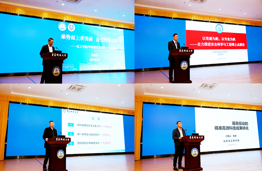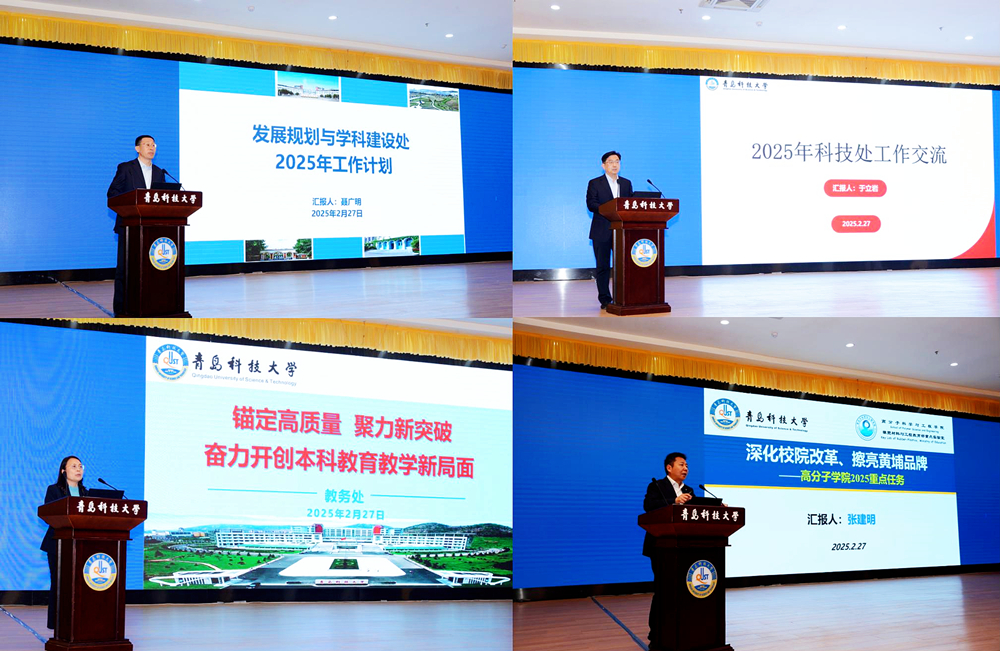 党委副书记李勇、沈文青主持工作交流环节。发展规划与学科建设处、科技处、教务处、高分子学院、化工学院、环境学院、经管学院、济南校区等8个机关部门和学院(校区)进行了工作交流。
