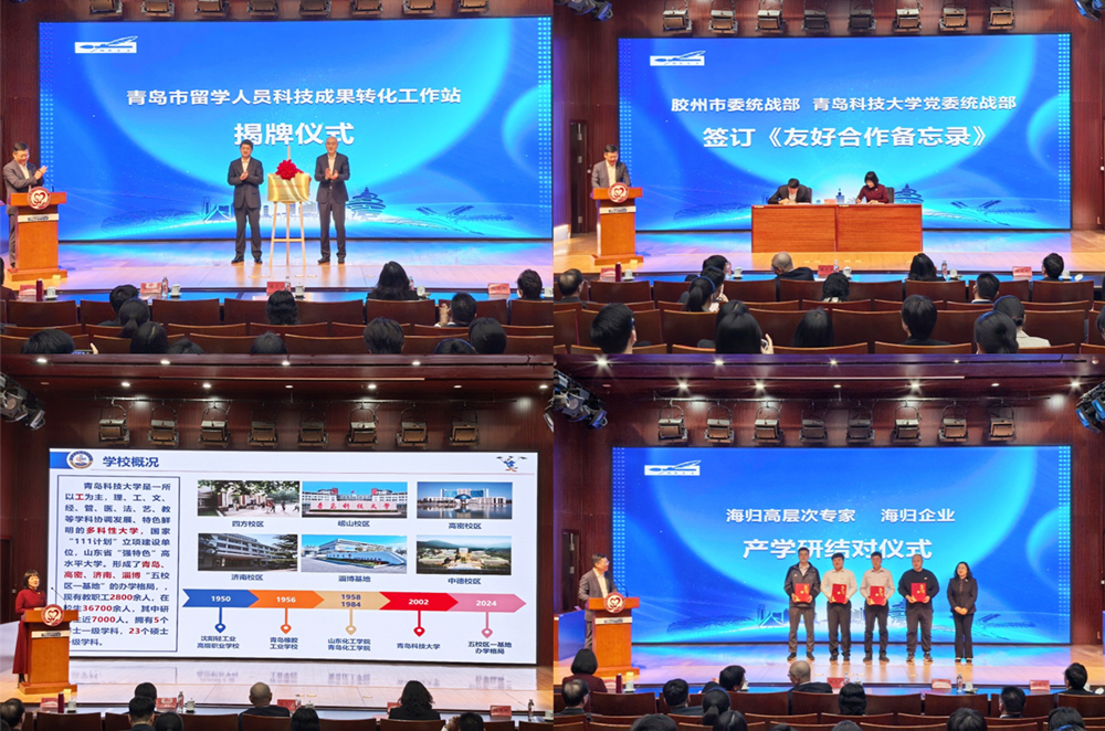 会上,陈克正、董如增共同为“青岛市留学人员科技成果转化工作站”揭牌。秦姣代表学校党委统战部与胶州市委统战部签订《友好合作备忘录》,并以《发挥政产学研融合优势 赋能新质生产力高质量发展》为题作主旨报告。学校海归高层次专家潘家敬、柴文楠分别与胶州市海归企业进行产学研结对。
