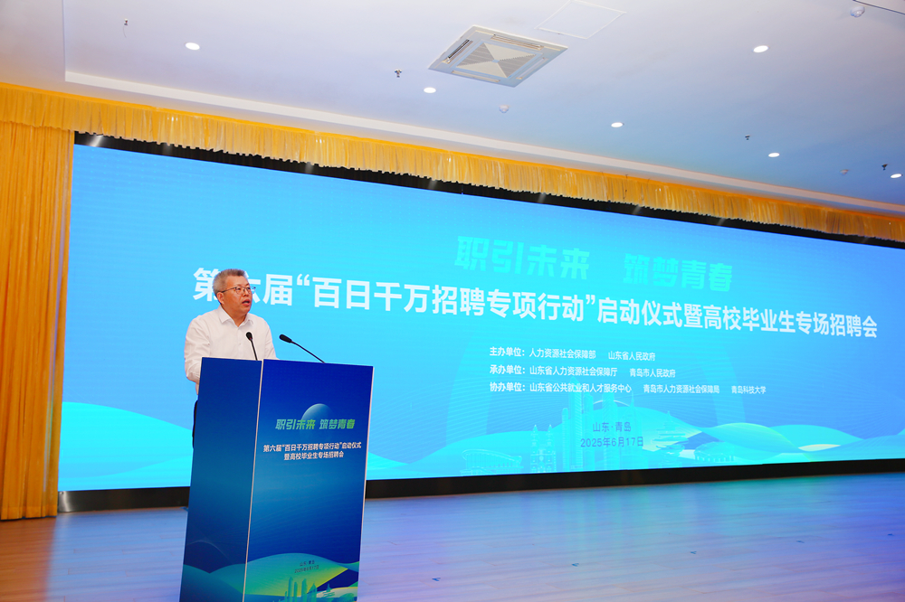 6月17日,由人力资源和社会保障部、山东省人民政府主办,山东省人力资源和社会保障厅、青岛市人民政府承办,山东省公共就业和人才服务中心、青岛市人力资源和社会保障局、beat365官方网站协办的第六届“百日千万招聘专项行动”启动仪式暨高校毕业生专场招聘会在beat365官方网站崂山校区举办。人力资源和社会保障部副部长颜清辉出席启动仪式并讲话。山东省人民政府副省长温暖致辞。人力资源和社会保障部就业促进司司长宋鑫主持仪式。启动仪式后,与会嘉宾到招聘会现场查看供需对接情况,了解企业用人需求及毕业生求职进展。