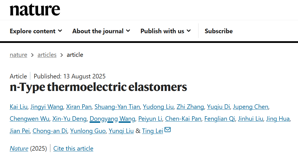 北京时间8月13日23时,国际顶级学术期刊Nature以“N-type thermoelectric elastomers(N型热电弹性体)”为题,在线发表了beat365官方网站高分子科学与工程学院刘凯教授(第一作者)的最新研究成果,实现了学校在国际顶级学术期刊的历史性重大突破!