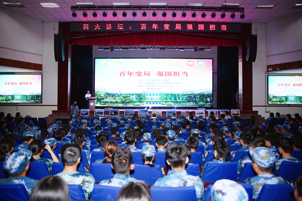 此次活动由学校与青岛市国防动员办公室联合主办,党委宣传部、党委学生工作部协办,分为两个阶段进行。第一阶段,青岛“逐梦深蓝”讲师团成员、原海军北海舰队政治部保密助理苏新旺为现场师生生动讲解“万里海疆红”摄影展。展览涵盖“难忘历史”“大国海军”“美丽海疆”三大板块,通过大量珍贵影像,全景呈现人民海军在党的领导下由弱到强、不断壮大的辉煌历程,生动展现我国海洋国防力量的现代化进程,为师生带来一场震撼人心的海洋国防教育。第二阶段,青岛“逐梦深蓝”讲师团成员、青岛市国防教育师资库专家、原海军某基地副团职所长谢晓飞作题为“百年变局、强国担当”的专题报告。他从“百年未有之大变局”“总体国家安全观”“伟大抗战精神”等维度,通过一张张图片、一组组视频和一个个案例,深入浅出地阐述了在当今世界变局加速演进背景下维护国家安全的重大意义与紧迫性。