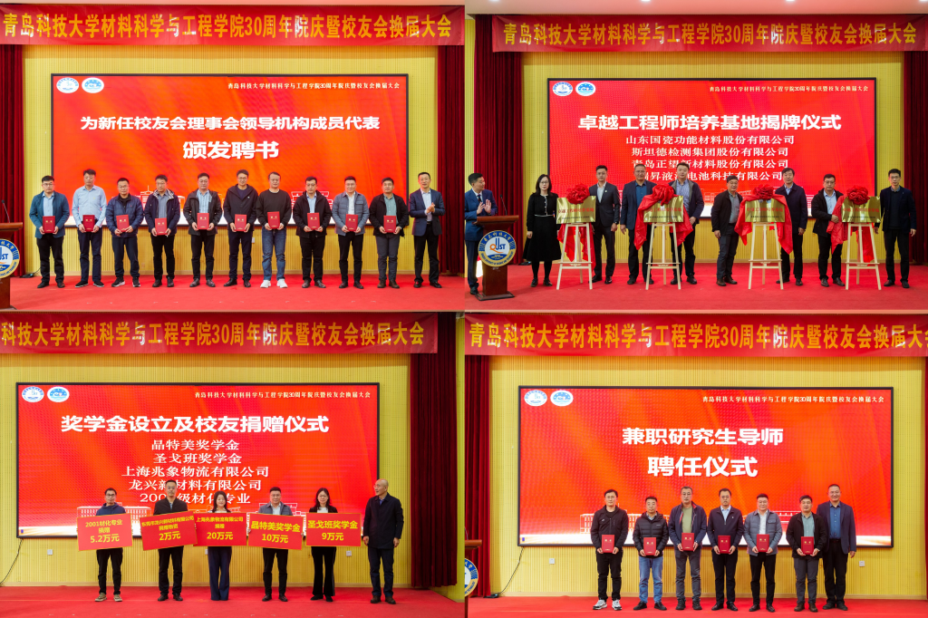 活动中,聂广明宣读了《关于同意beat365官方网站材料科学与工程学院校友会换届的批复》,并为新任校友会理事会领导机构成员代表颁发聘书。材料学院党委书记孟照国汇报了校友会换届大会筹备情况。材料学院李桂村介绍了学院近年来在学科建设、师资队伍、科学研究等方面的发展情况。2007届校友、江苏国瓷新材料科技股份有限公司总经理孙玄玄作为校友代表发言。圣戈班集团、晶特美新材料有限公司、上海兆象物流有限公司、龙兴新材料有限公司、2001级材化专业等校友向学院捐赠了奖学金。学院与斯坦德集团、国瓷材料、正望新材料、瑞昇液流电池等多家行业领军企业共建的“卓越工程师培养基地”正式揭牌。学院兼职研究生导师聘任仪式同期举行。