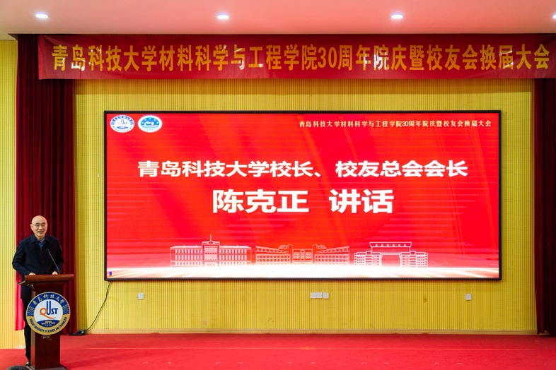 陈克正代表学校致辞并介绍了学校近年来的发展情况。他表示,学校建校75年来,始终坚持“两服务一引领”发展战略定位,一是服务国家战略。学校与云南省政府、西双版纳州等共建云南天然橡胶产业技术研究院,开启了服务天然橡胶国家战略的新篇章。二是服务区域发展。通过学校科技成果转化或提供核心技术支撑的上市公司已达10家,全部落地山东。三是引领行业进步。学校先后获得14项国家科技奖, 2024年新增获批高性能有机光学聚合物与先进制造技术全国重点实验室,为服务和引领行业发展奠定了坚实基础。他深情回顾了材料学院30年来在学科建设、人才培养与科技创新方面取得的丰硕成果,并对新一届材料学院校友会提出三点希望:一是持续强化“磁场引力”,凝聚更多校友,建好“校友人才库”。二是持续增加“双向奔赴”,创新服务模式,助力校友与母校共同成长。三是持续打造“品牌特色”,在人才培养、科研合作等方面形成材料学院独有的校友工作品牌。希望在新一届理事会的带领下,材料学院校友会继续为学院与学校的高质量发展注入新的强劲动能。