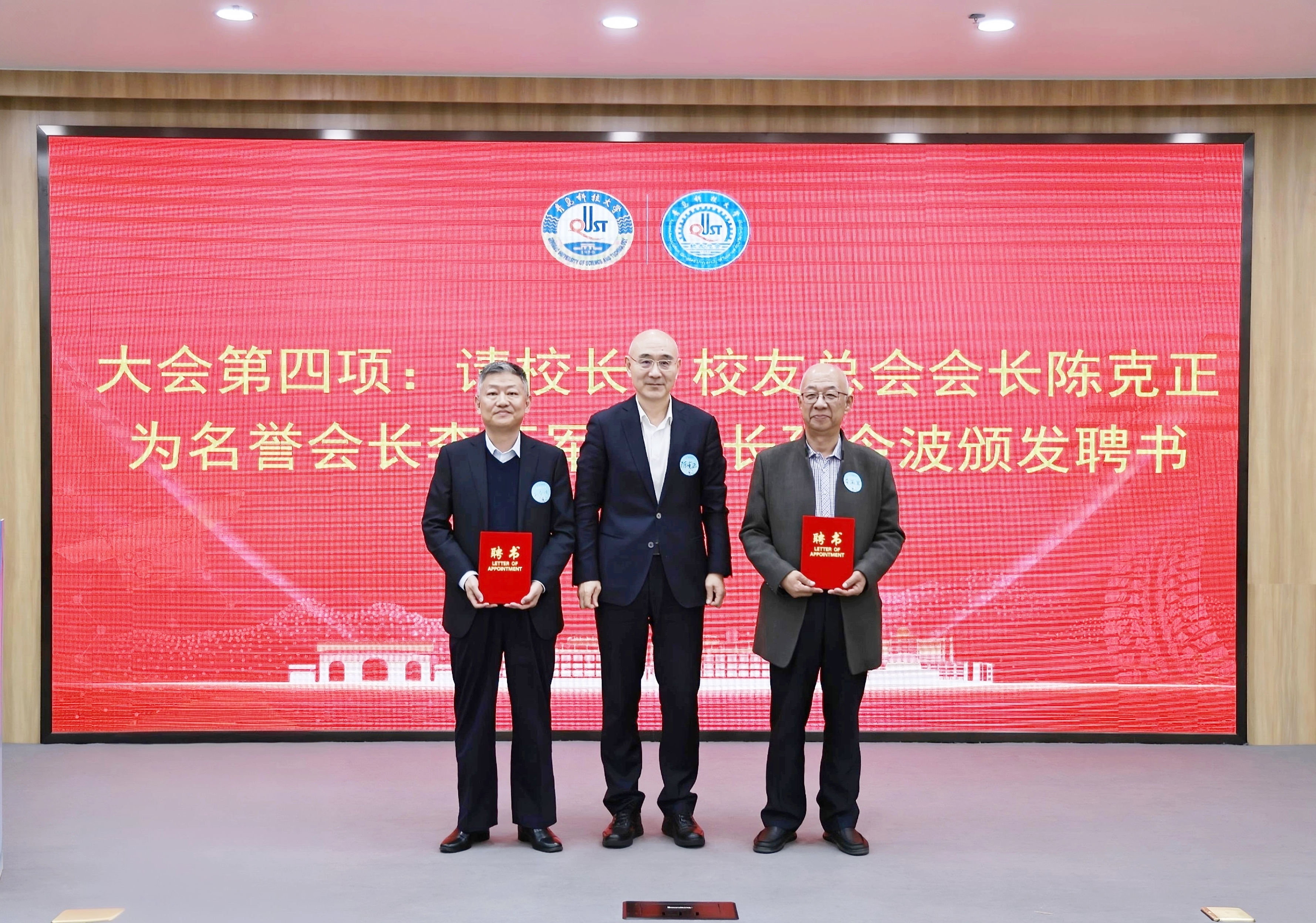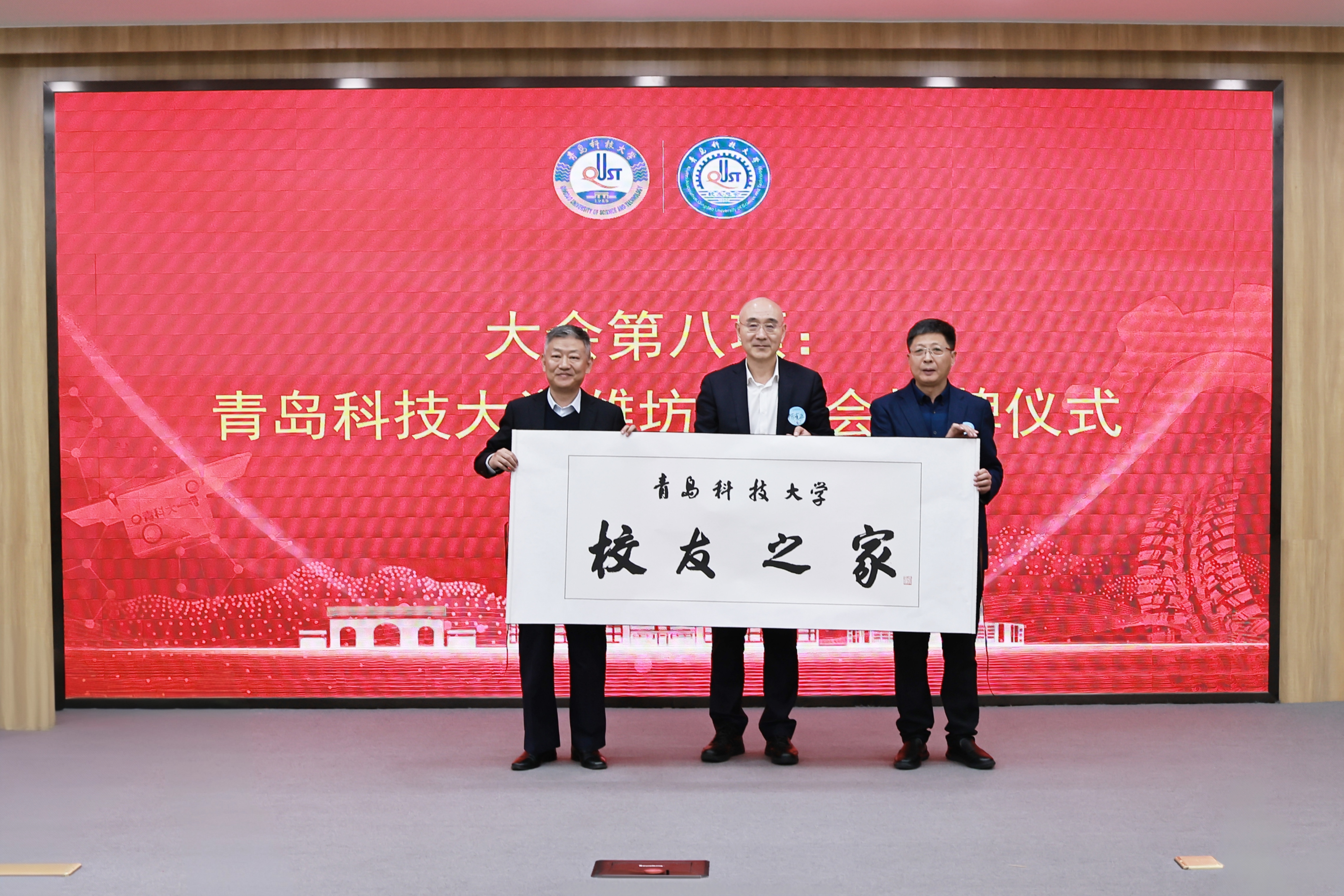 陈克正为潍坊校友会第四届理事会名誉会长、会长颁发聘书,为新换届的校友会授旗,并共同为潍坊“校友之家”揭牌。