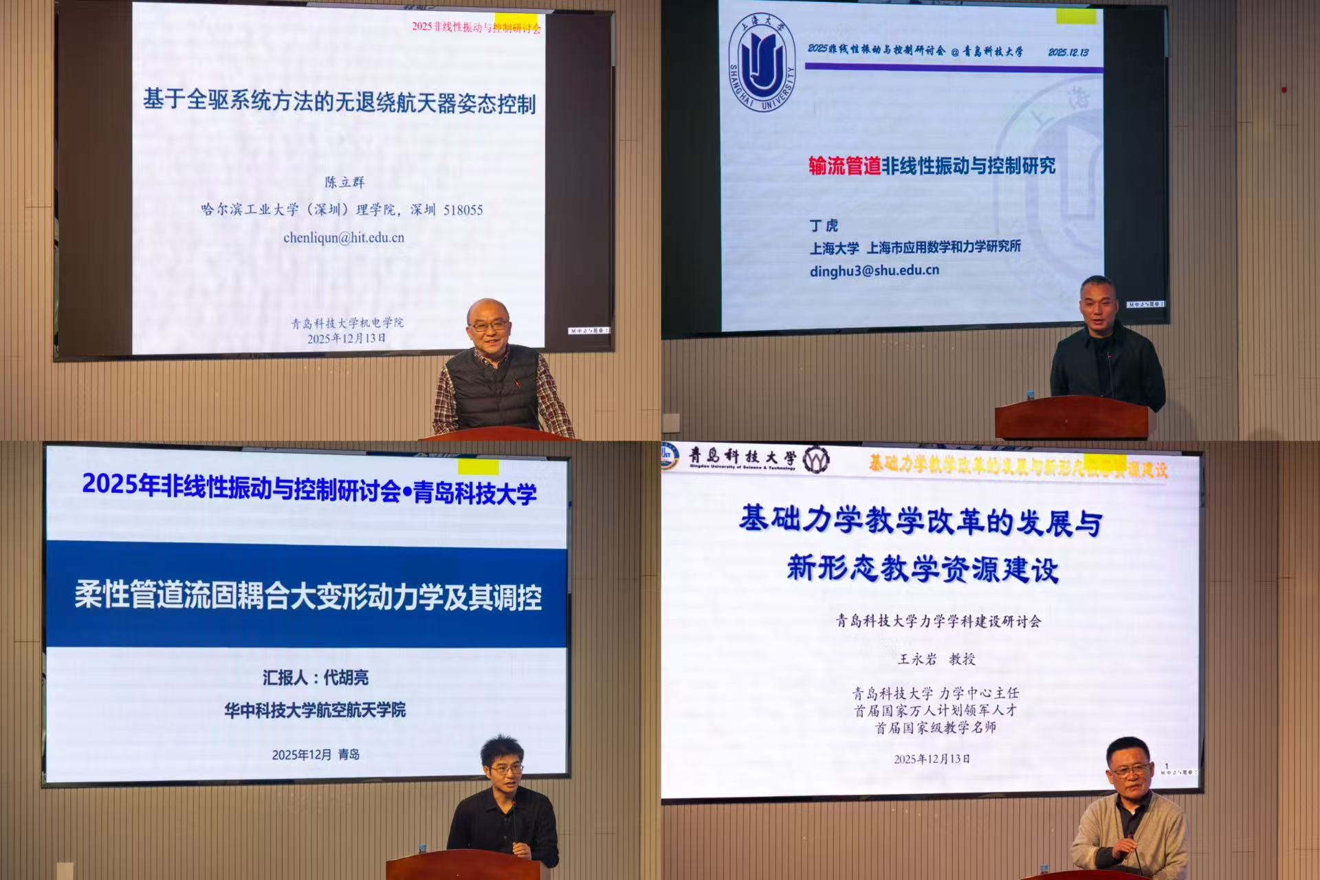 在大会报告环节,哈尔滨工业大学(深圳)国家杰出青年科学基金获得者陈立群教授,上海大学国家杰出青年科学基金获得者丁虎教授,华中科技大学国家优秀青年科学基金获得者代胡亮教授,beat365官方网站国家万人计划领军人才王永岩教授,分别围绕“基于全驱系统方法的无退绕航天器姿态控制”、“输流管道非线性振动与控制研究”、“柔性管道流固耦合大变形动力学及其调控”、“基础力学教学改革的发展与新形态教学资源建设”等主题作了精彩报告。