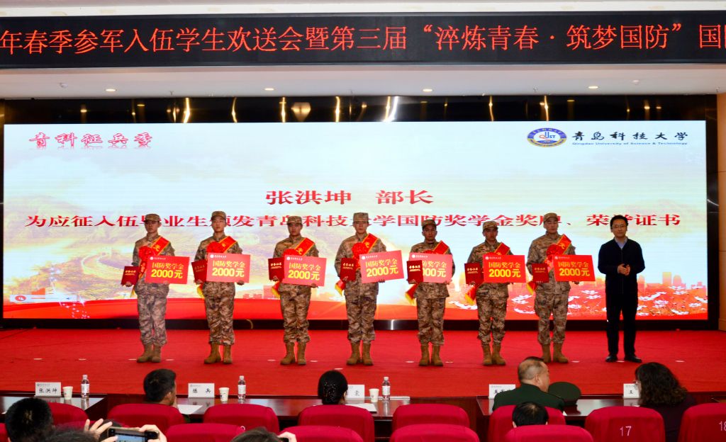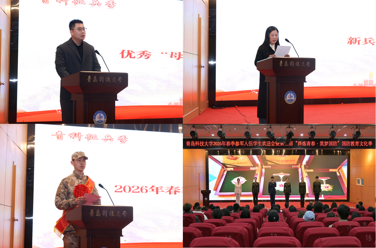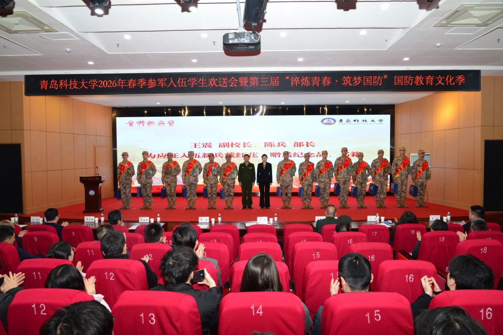 3月16日,学校2026年春季参军入伍学生欢送会暨“淬炼青春·筑梦国防”主题教育活动在崂山校区举行。青岛市市北区委常委、市北区征兵办主任、市北区人武部部长陈兵,驻青某部队优秀官兵代表王军伟,青岛市国防体育运动协会常务副会长张皓,学校党委常委、副校长王震,党委常委、宣传部部长张洪坤等出席仪式。