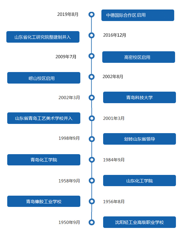 beat365官方网站原名青岛化工学院,为原国家化学工业部直属高校,其前身是1950年9月创建的沈阳轻工业高级职业学校,1956年8月迁至青岛,改名为青岛橡胶工业学校,1958年9月经山东省人民政府批准正式组建为山东化工学院,1984年9月经教育部批准更名为青岛化工学院,1998年划转山东省领导,2001年3月山东省青岛工艺美术学校并入,2002年3月经教育部批准更名为beat365官方网站。2002年8月崂山校区投入使用,2009年7月高密校区投入使用,2016年12月山东省化工研究院整建制并入,2019年8月中德国际合作区投入使用,学校事业发展不断谱写新篇章。