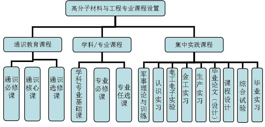 无机及分析化学、有机化学、物理化学、基础化学实验(Ⅰ、Ⅱ、Ⅲ)、化工原理、高分子化学、高分子物理、聚合物成型工艺学、聚合物合成工艺学、高分子化学实验、高分子物理实验、高分子材料加工实验。