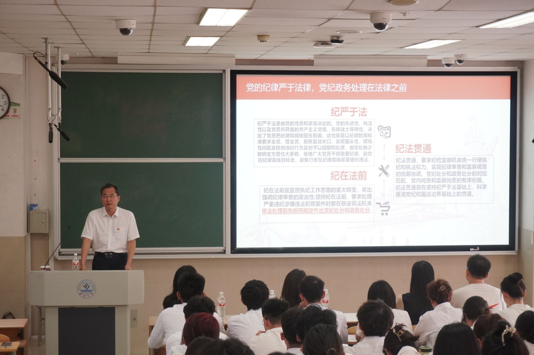 学院党委书记贺铭为毕业生党员讲授题为《明党纪 强党规 做新时代廉洁自律的表率》的党纪学习教育专题党课。贺铭通过详实的数据、丰富的案例,围绕“什么是党的纪律,党的百年纪律建设的历史脉络,党的百年纪律建设的基本经验,以案明纪——身边的违纪违法案例”等内容做了详细的讲解,希望同学们牢记党员身份,发挥模范作用,以党纪学习教育为契机,强化政治意识,纪律意识,规矩意识和廉洁意识,系好廉洁自律的第一粒扣子。