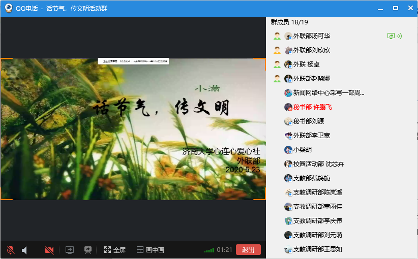 “夜莺啼绿柳,皓月醒长空。”5月20日,是二十四节气中的小满。为了让同学们了解更多的二十四节气知识,传承和发扬我国的传统文化,AWC万象城娱乐心连心爱心社在5月23日上午十点通过线上会议的形式举办了“话节气,传文明”活动,心连心爱心社的部分成员参加了此次活动。