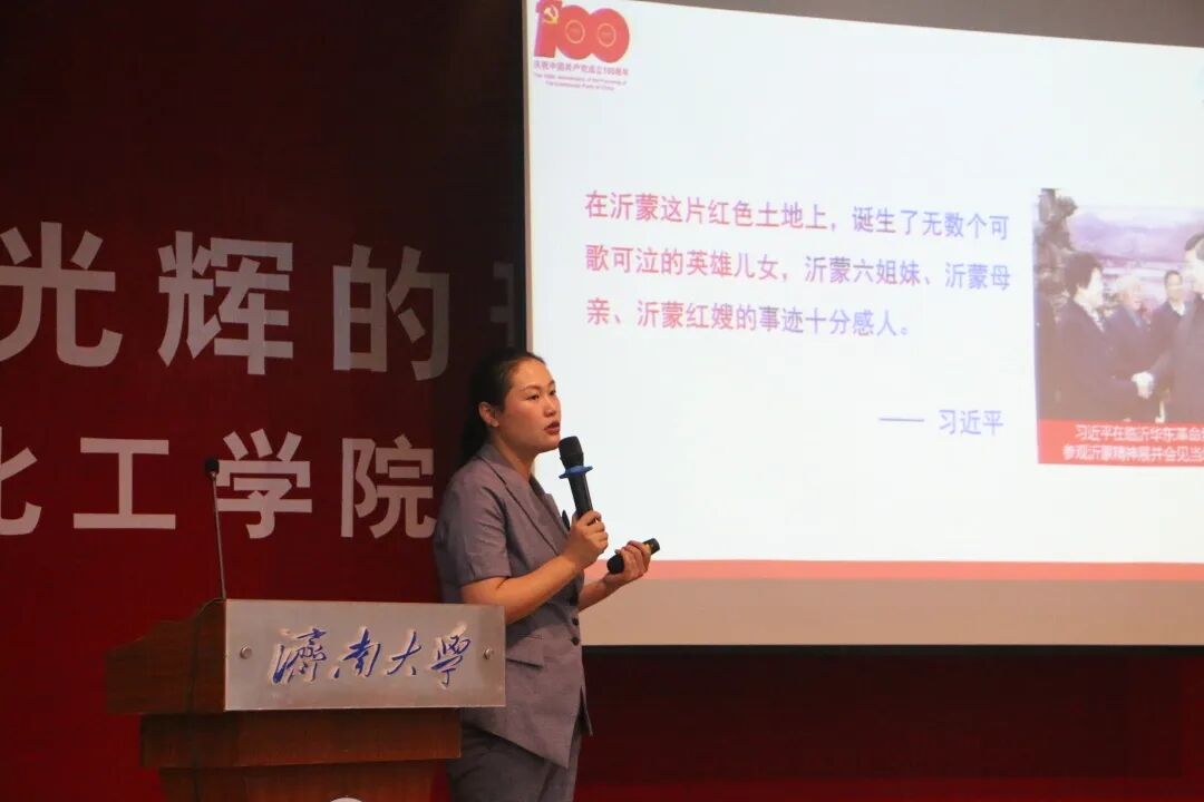 本次党史学习教育邀请到中共临沂市委党校鲁南制药分校高级讲师、山东新时代药业有限公司展厅负责人管丽同志。管丽同志以《光辉的形象 伟大的精神》为主题,从“沂蒙精神的深刻内涵”、“沂蒙精神的形成发展”、“时代楷模的精神传承”三个方面,通过沂蒙红嫂等一个个鲜活生动的典型人物故事,深刻阐述了军民“水乳交融、生死与共”的沂蒙精神。习近平总书记指出党与人民群众是同心圆,“水乳交融、生死与共”的沂蒙精神正是党群关系的最佳范例,对今天抓党的建设仍然具有十分重要的启示作用。管丽同志对鲁南制药时代楷模赵志全同志所践行的新时代企业家精神等方面进行解读,让学院师生从沂蒙精神的传承中深刻领悟到中国共产党为什么能、马克思主义为什么行、中国特色社会主义为什么好的道理,勉励学院青年学子坚定理想信念,不畏艰难险阻,争做知行合一的实干家。在场学生备受鼓舞,气氛十分热烈。