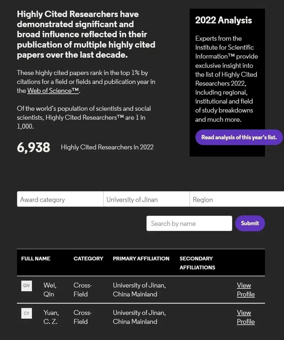 据悉,该榜单是遴选全球高校、研究机构和商业组织中对所在研究领域具有重大和广泛影响的顶尖科学人才,数据是根据2011年1月至2021年12月的11年期间所发表的高被引论文数量遴选得出。遴选方法是基于科睿唯安科学信息研究所文献计量专家所进行的数据分析,利用 InCites™ 和 ESI™,按照基于学术论文发表数量和Web of Science™引文数据的科研绩效指标和趋势数据专门制定。