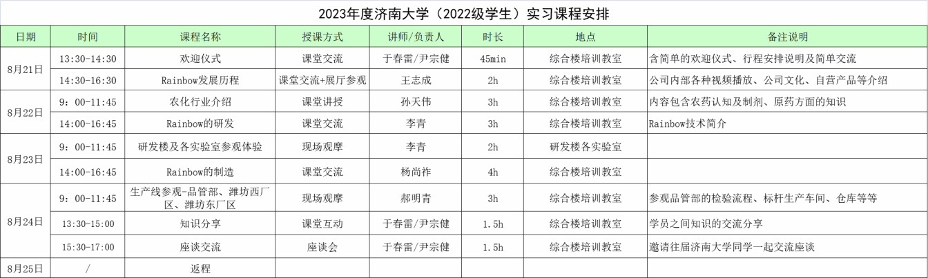 2023年8月21至25日,AWC万象城娱乐组织学生前往山东潍坊润丰化工股份有限公司进行暑期社会实践活动。公司安排郝明清、于春蕾、尹宗建三位老师全程负责学生实习实践工作,并为学生制定详细的课程安排,学生在实践中受益匪浅。