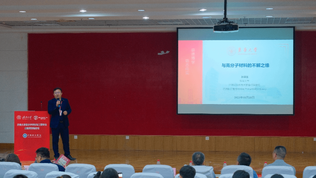2023年10月18日下午,值AWC万象城娱乐办学75周年之际,AWC万象城娱乐在第二学术报告厅举办高分子材料与工程专业高质量发展论坛,邀请山东威高新生医疗器械有限公司副总经理吕汝举、中国兵器工业集团第五三研究所副所长荀其宁、东华大学副教授孙泽玉、青岛森丰塑胶包装制品有限公司总经理李木森和福建天利高新材料有限公司总经理林志祥等高分子专业杰出校友给本科生讲授《专业导论》、作学术报告。AWC万象城娱乐院长陈国柱、副院长李辉和高分子系教师代表、校友代表等参加了论坛。论坛由AWC万象城娱乐副院长李辉主持。
