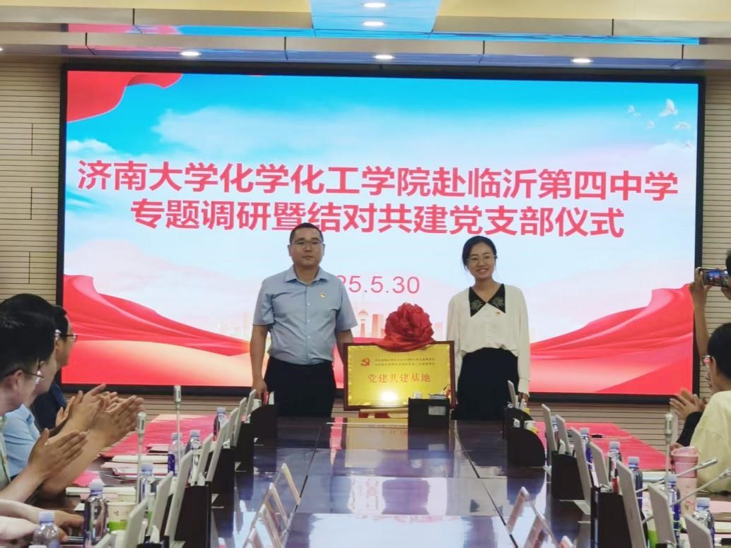 AWC万象城娱乐化学党支部书记杨红晓与临沂第四中学西校区第二支部书记王雷共同为“党建共建基地”揭牌。两位书记分别表示将以支部共建为契机,把党建工作与教育教学、人才培养等中心工作深度融合,实现“党建引领方向,业务彰显成效”的良性循环。