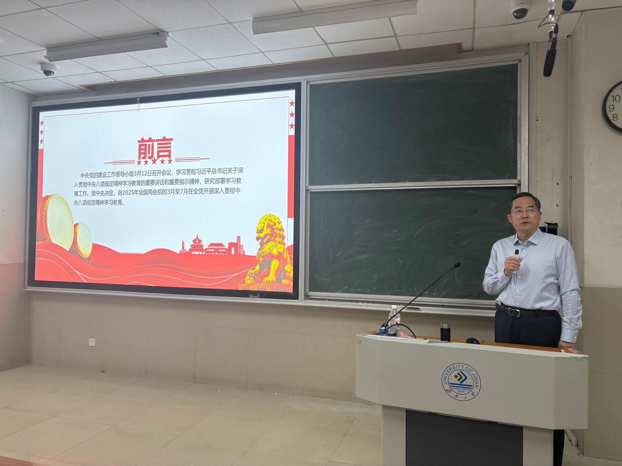 贺铭以《深入贯彻中央八项规定精神学习教育》为主题,解读了中央八项规定精神内涵与青年学生践行路径。他结合党的百年奋斗历程,系统阐释了中央八项规定的制定背景、核心要义及深远意义。立足高校实际和青年特点,结合近年来高校系统违反中央八项规定的典型案例,通过详实的案例和数据,深入剖析“四风”问题的隐形变异表现,并强调青年学生尤其要在科研诚信、学风建设、社会实践、网络言行等方面筑牢底线意识。最后他提出三点希望:一是要明大德、守公德、严私德,以党的纪律为镜鉴,争做崇廉尚洁的“表率者”;二是要勤学善思、知行合一,将八项规定精神贯穿于学术科研、志愿服务和日常生活中,当好优良作风的“传承者”;三是要心怀“国之大者”,用实际行动践行“请党放心,强国有我”的青春誓言,在服务国家重大战略需求中彰显济大化院青年的责任担当。