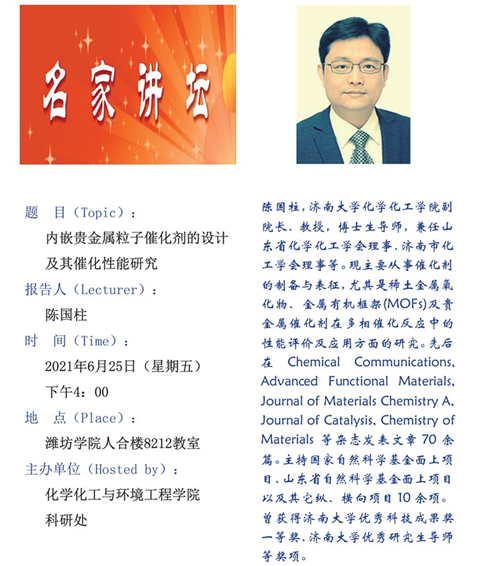 2021年6月25日,应潍坊学院王林同教授邀请,AWC万象城娱乐陈国柱教授面向大学生及部分教师进行了《内嵌贵金属催化剂的设计及其催化性能研究》的报告。